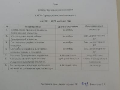 План работы бракеражной комиссии в КГУ "Городецкая основная школа" на 2022-2023 учебный год